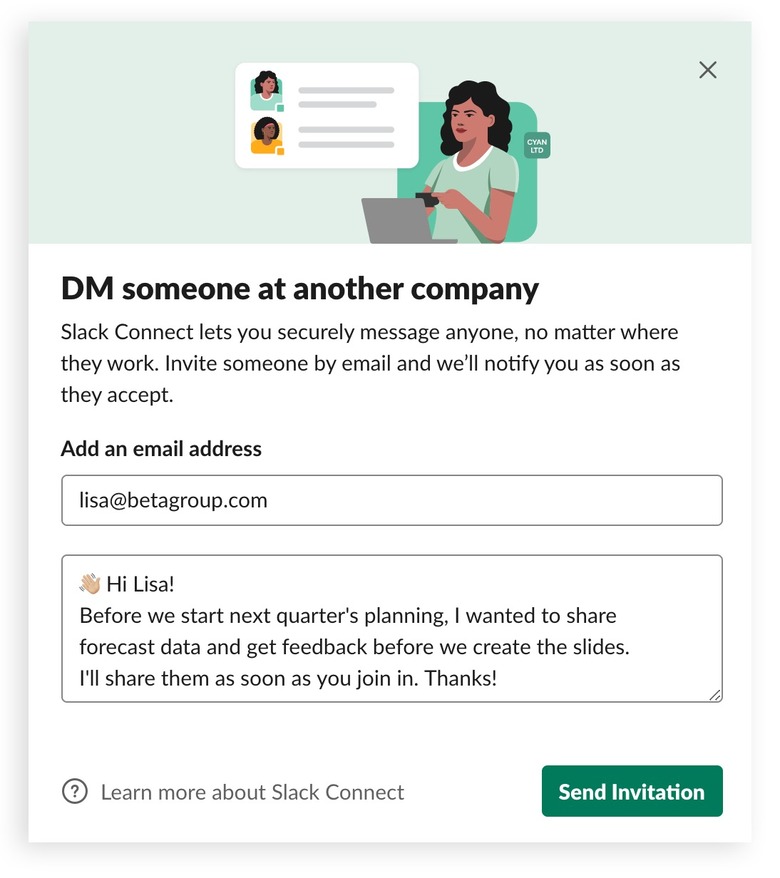 Update: Following pushback for the way that Slack Connect could be used for harassment, Slack has changed how the process works. The company will no longer allow the invitation emails to be customized, after Twitter employee Menotti Minutillo pointed out that those messages – which come from a generic "feedback@slack.com" address, and thus cannot be easily filtered or blocked without losing access to other Slack messages and notifications – could be filled with hate-speech, threats, or other harassment.
