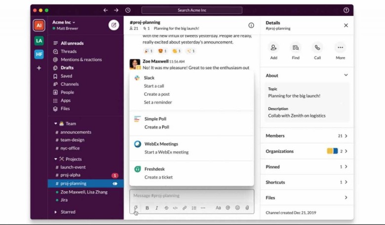 Slack says that over 'coming weeks,' the new shortcuts menu will also feature Slack apps like Cisco WebEx Meetings, Freshdeck, and Simple Poll in addition to the built-in tools. These features will start arriving for users soon and will roll out over the next handful of weeks.