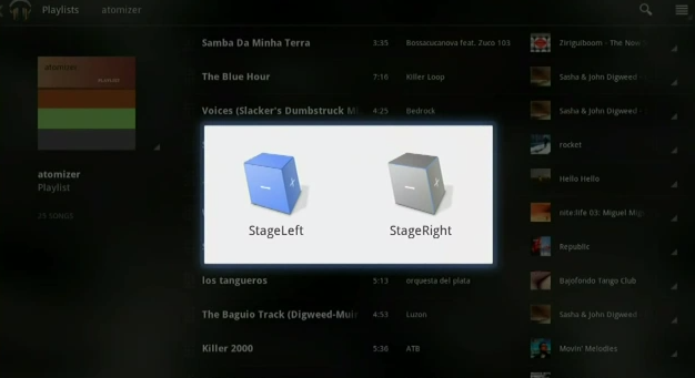 The control device, aka the one that looks like a leaning box here with lights flashing in its seams, is controlled by your Android smartphone or tablet. In the interface on Google Music you're able to see which devices you're connected to, and in this case you've got "Stage Left" and "Stage Right", the names of the two Tungston controllers connected to speakers.