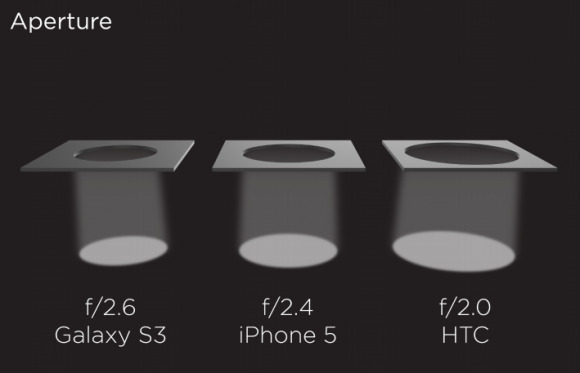 HTC shows quite simply how the HTC One uses the largest of three apertures available in some of the best selling smartphones on the market today, with the Galaxy S III working with an f/2.6 and the iPhone 5 utilizing an f/2.4. With the HTC One's f/2.0 size, one whole heck of a lot more light is able to be let in, this resulting in better results in low-light photo conditions.