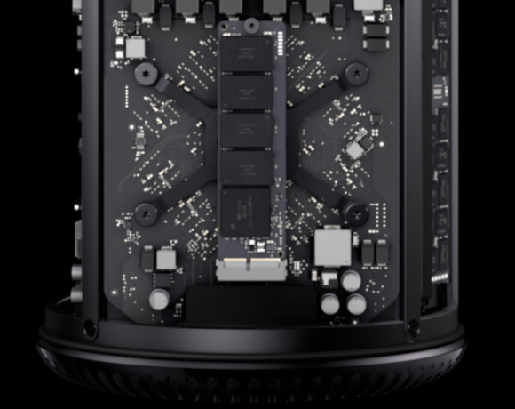 Apple has been transitioning to flash storage as much as it can over the past few generations of MacBook and Mac, and so it comes as no surprise that the new Mac Pro also does away with traditional drives. Where the existing Mac Pro uses regular SATA drives, the 2013 model steps up to PCI Express flash storage that, the company claims, is up to ten times the speed of a SATA HDD.
