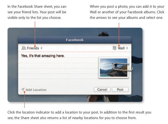 Just as it is in iOS 6 – coming to an iPad and iPhone near you soon – you'll be able to easily work with Facebook throughout your Mac. Sign in once and you'll have easy posting of links and photos forever more. Your Facebook friend will appear in your Contacts automatically and you'll receive updates in your Notification Center as well.