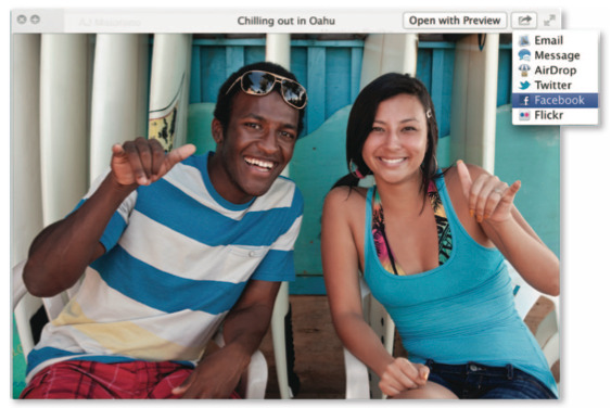 Safari is only one of several apps throughout OS X Mountain Lion that benefit from the system's ability to instantly share a variety of elements. Built-in sharing allows you to use Mail, Messages, AirDrop, Twitter, Facebook, Flickr, and Vimeo to share.