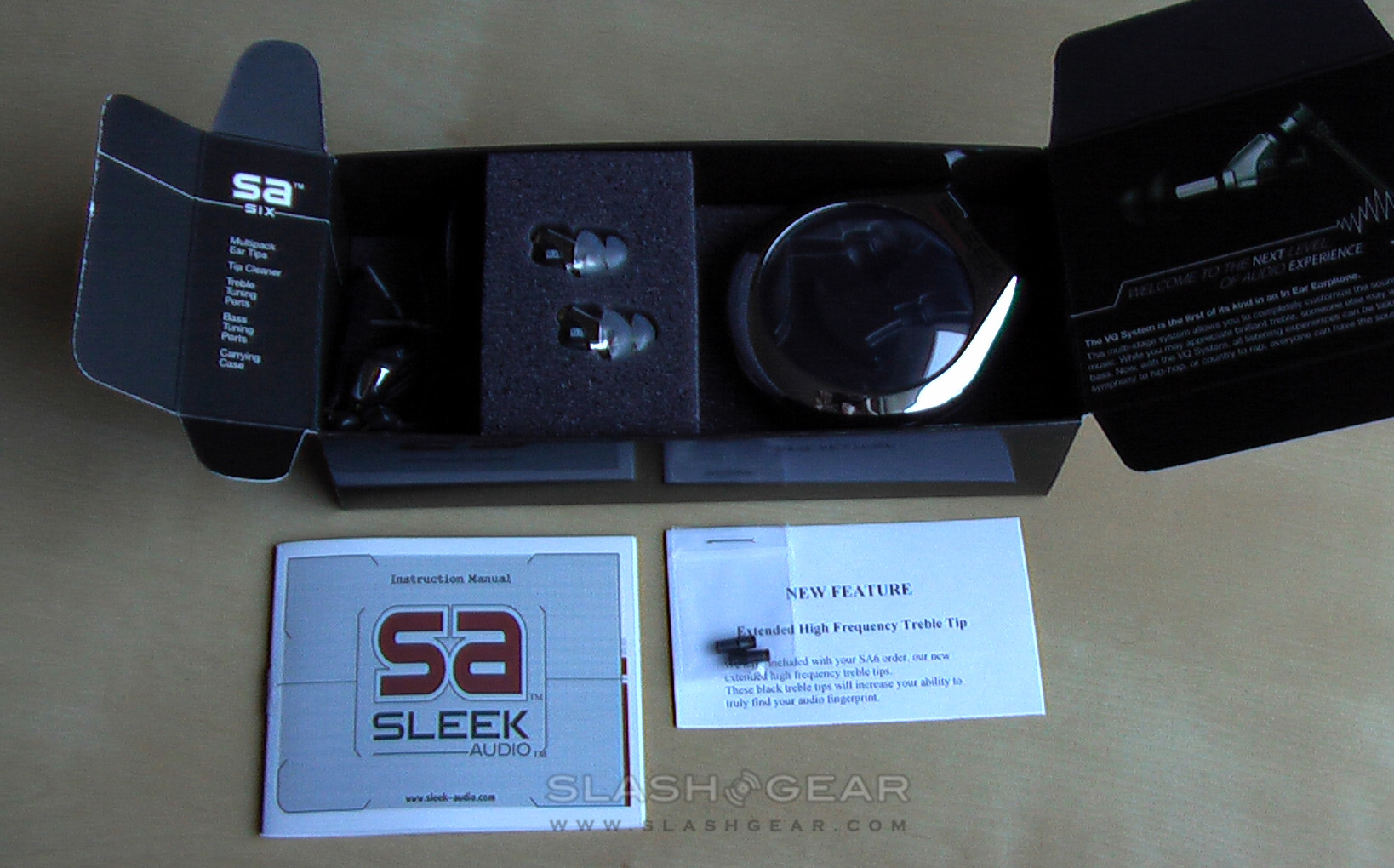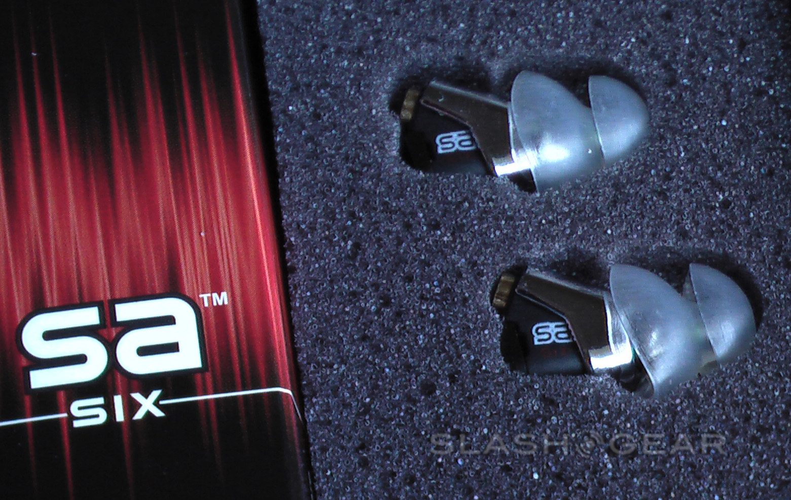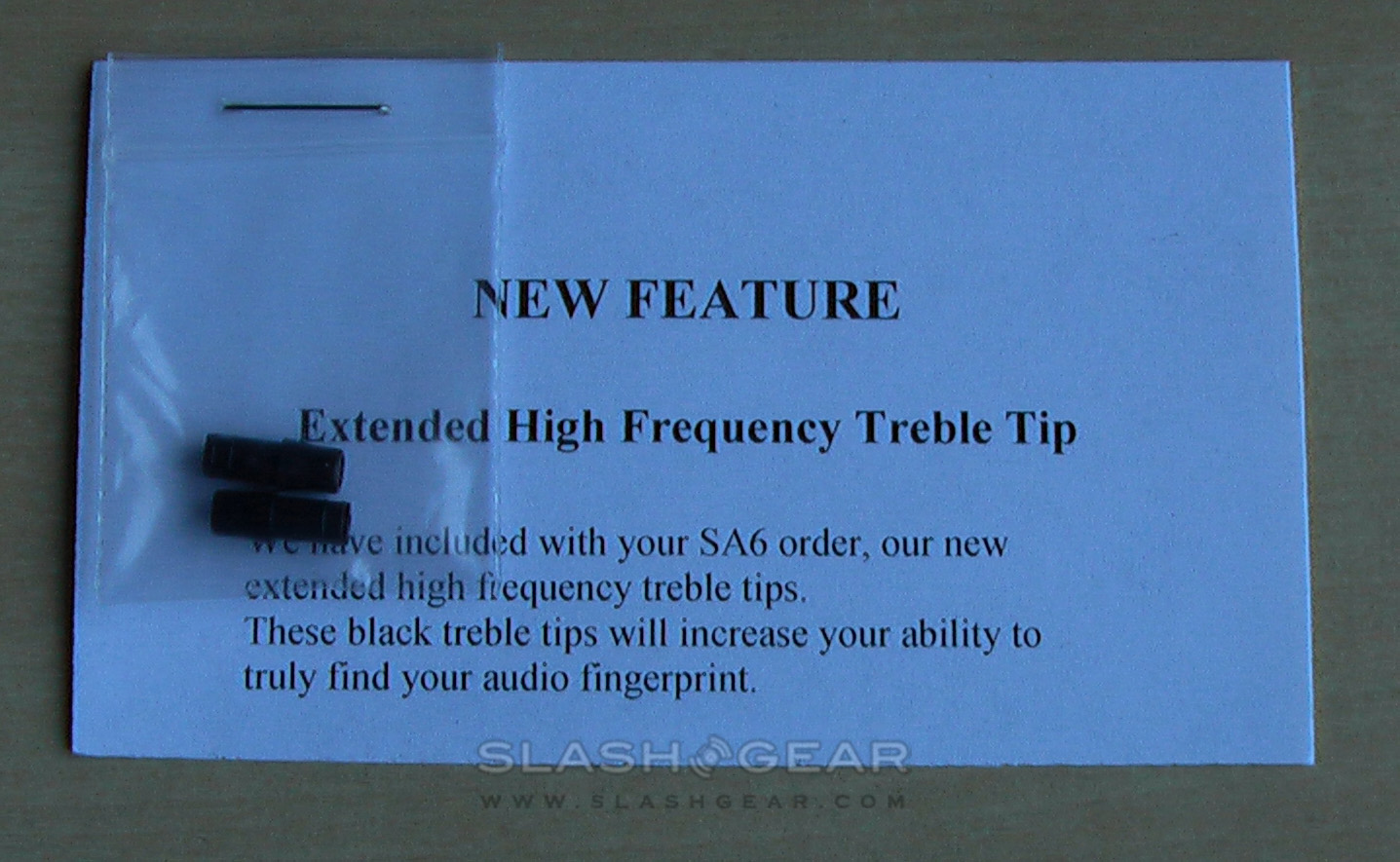 First impressions are good, with the SA6's being smaller but no less sturdy than rivals from Ultimate Ears and other high-end earphone manufacturers. There's a fair amount to be explored in the foam-cushioned box: the earbuds themselves, pre-fitted with the medium silicone tips, neutral treble tubes and bass tubes, positive and negative versions of the treble and bass tubes, small and large tips and a removable 60-inch cable. There's also a hard-plastic carry-case, with a pull-out tray for the earbuds around which the cable can be wound, and two small tools for swapping out the different frequency tubes and cleaning inside the silicone tips. A seemingly late addition to the package is a pair of "extended high frequency" treble tubes.