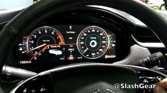 The center stack has the same zero-profile touch sensitive buttons, topped by an 8-inch 800 x 480 touchscreen with anti-gloss and oleophobic coatings, as we saw in the Cadillac ATS last year. However, the ATS's LCD sub display in the driver's binnacle has been replaced with a huge, 12-inch 1280 x 480 cluster display, capable of showing multiple instrument layouts and even 3D graphics of the car which can be scrolled through using wheel-mounted controls. It's all driven by a tri-core ARM11 processor running Cadillac's proprietary Linux OS.