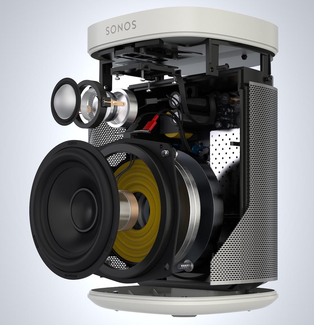 Behind the finely-machined silver mesh is a custom-designed mid-woofer and tweeter; Sonos doesn't like to talk about specific power output, though does say that there's new processing technology introduced on the PLAY:1 to squeeze more sound out of the speaker than you might expect.