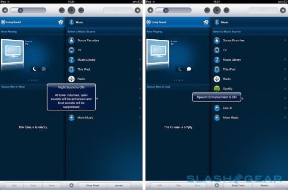 All that DSP means Sonos can add a couple of new features you wouldn't normally get on a PLAY speaker: Night Sound and Speech Enhancement. Toggled on or off through new buttons in the "Now Playing" section of the controller app, Night Sound aims to make the PLAYBAR more accommodating to those who like to watch movies while everyone else is asleep. In short, it compresses the audio, dampening louder sounds like explosions and gunfire, and enhancing quieter sounds like speech, so that all can be heard without forcing you to hover over the volume control like a hawk.