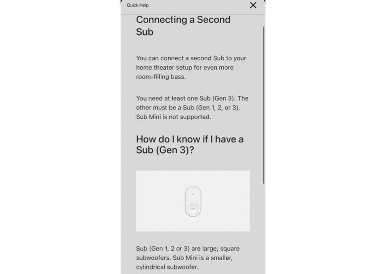 The Sub Mini's existence was confirmed in the Sonos app, at least based on a screenshot shared by Reddit user S114HED in the Sonos subreddit. The screenshot is from Sonos' "Quick Help" documentation on connecting a second Sub to one's existing audio setup, the support for which was introduced in December 2020.