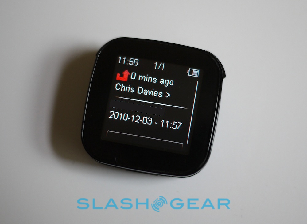 Unfortunately there's no touchscreen – likely to keep the price down – and instead the bezel around the display hides four touch-sensitive directional controls, with the right physical button acting as select. It's not as intuitive as, say, sweeping the display on the iPod nano. As well as flashing its notification light, the LiveView also has a vibration motor inside for discrete updates of new messages, calendar appointments and the like. It's not the most powerful we've seen, but it'll get your attention, particularly if you have the display clipped to your wrist.