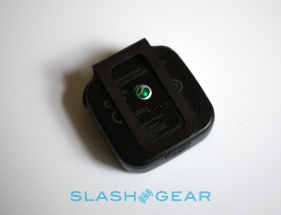 Measuring in at 35 x 35 x 11 mm, the plastic-bodied LiveView is a lightweight if somewhat thick black square, fronted by a 1.3-inch 128 x 128 color OLED display. On the back there's a metal clip, sturdy enough to keep the LiveView fixed snugly to your lapel or the shoulder-strap of your bag; Sony Ericsson also supply a nylon wrist-strap and a plastic frame assembly to turn the LiveView into a chunky watch. Hardware controls are limited to a power button with integrated multicolor LED on the top left corner and a second button on the top right; on the bottom edge there's a microUSB port for charging, covered with a somewhat fiddly rubber flap.