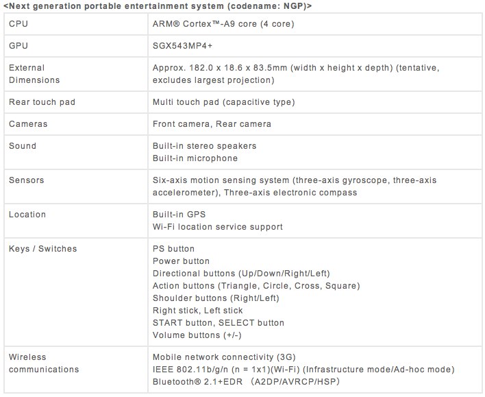 As expected, Sony has outed its "PSP2", currently codenamed the Sony next generation portable entertainment system or NGP, and expected to go on sale at the end of 2011. Based on a quad-core ARM Cortex A9 processor and Imagination Technologies PowerVR SGX543MP4+ GPU, the NGP has a 5-inch OLED 960 x 544 multitouch-capable touchscreen on the front and a multitouch pad on the back, for what Sony describes as "touch, grab, trace, push and pull" gestures in gameplay.