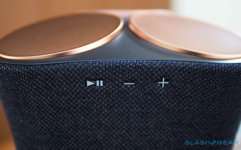 The controls are clustered on the upper edges, on two of the three sides. Touch-sensitive buttons take care of play/pause and volume on one edge, and power, input switching, and auto-calibration on the other. An NFC patch on the back supports Android quick-pairing.