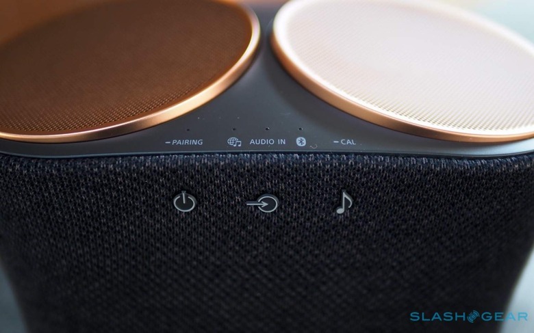 Inside there are three upward-firing drivers angled to bounce sound off the ceiling and walls, three mid speakers pointing out from the RA5000's midriff, and a subwoofer underneath. Each driver gets a separate channel from the 7-channel amp, and there's optional automatic volume adjustment to balance out mixed genre playlists. Auto sound calibration, meanwhile, uses a brief series of tones to adjust the EQ according to the acoustic qualities of the room.
