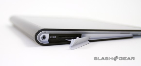 Where Sony first pulls away from the pack is in the physical design; this is no basic slab. Sony calls it "folding design" and says the tapering form-factor is based on a folded-back magazine. The company has even carried that through to the rear panel, emphasizing the asymmetry with a ridgeline where the curve ends, and using contrasting white and black plastic to highlight. Ports – including a full-sized SD card reader, useful for quickly checking shots from your digital camera, and microUSB, though no HDMI – are clustered in the white end-caps, some under flip-out panels.