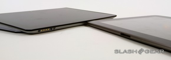 It's a design concept we've seen attempted before – Notion Ink's Adam, for instance, has a swollen battery bulge intended to offer an easier grip – but Sony's downsizing abilities make it more successful. The Tablet S is purposefully made with off-center balance so that, when you're holding it in portrait orientation and gripping the thicker edge, the weight is biased to your hand. That reduces the leverage effect; we found we could hold the slate single-handedly for longer than with regular tablets. The downside to the lightweight is that it feels less "premium" than, say, the aluminum iPad 2, instead being more plasticky like the Galaxy Tab 10.1. Unfortunately it's also – even at its thinnest edge – thicker than the Samsung.