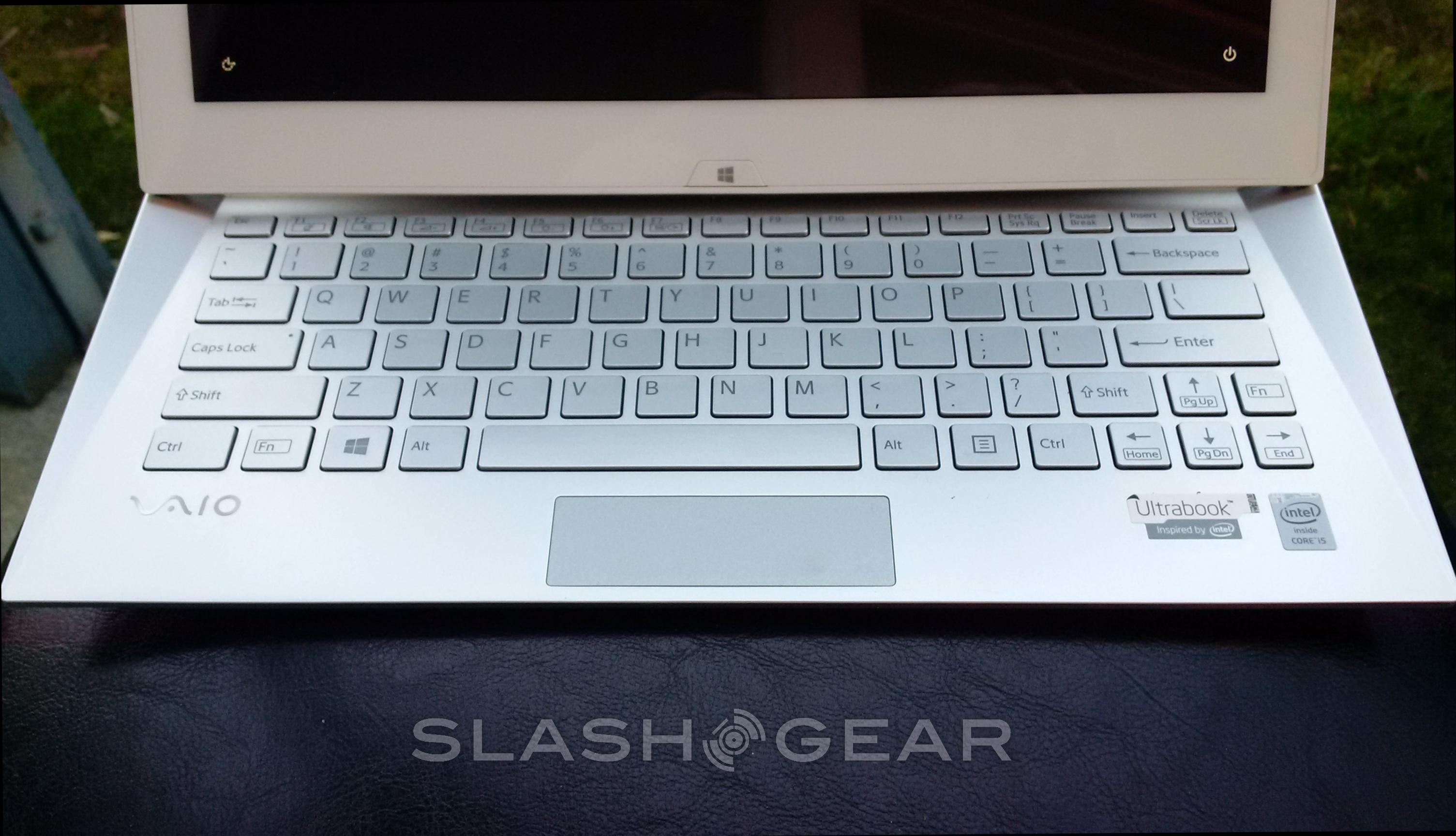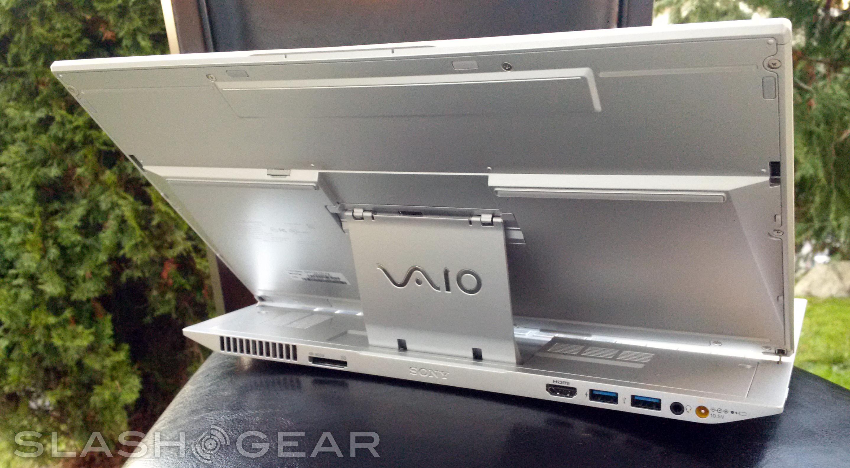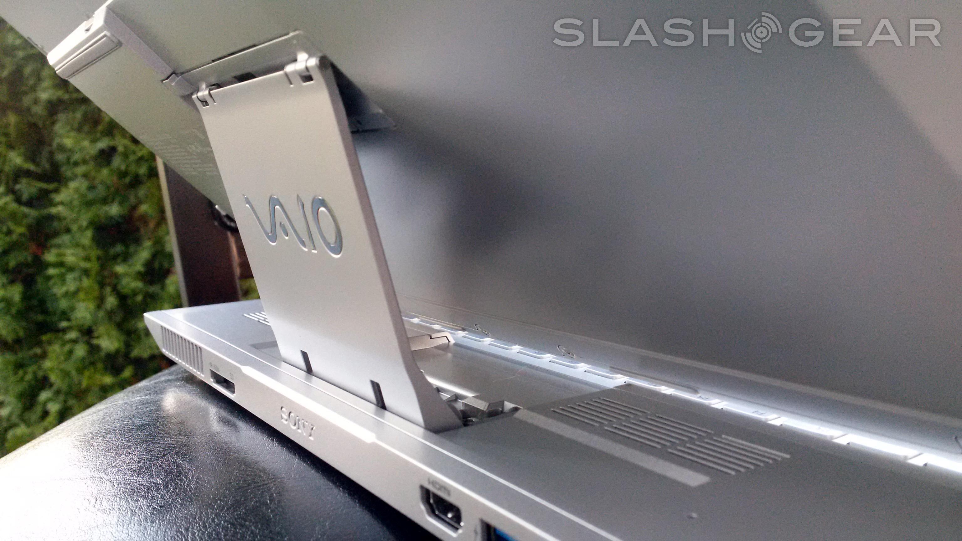 Though the hinge is different, the slider-style design we saw with the Sony VAIO Duo 11 is implemented with the larger model. Opening the display to switch the device from tablet to laptop is simple, requiring a gentle tug on the back of the display just behind the webcam. Once lifted half an inch or so, the hinge and sliding mechanisms take over and the display slides backwards.