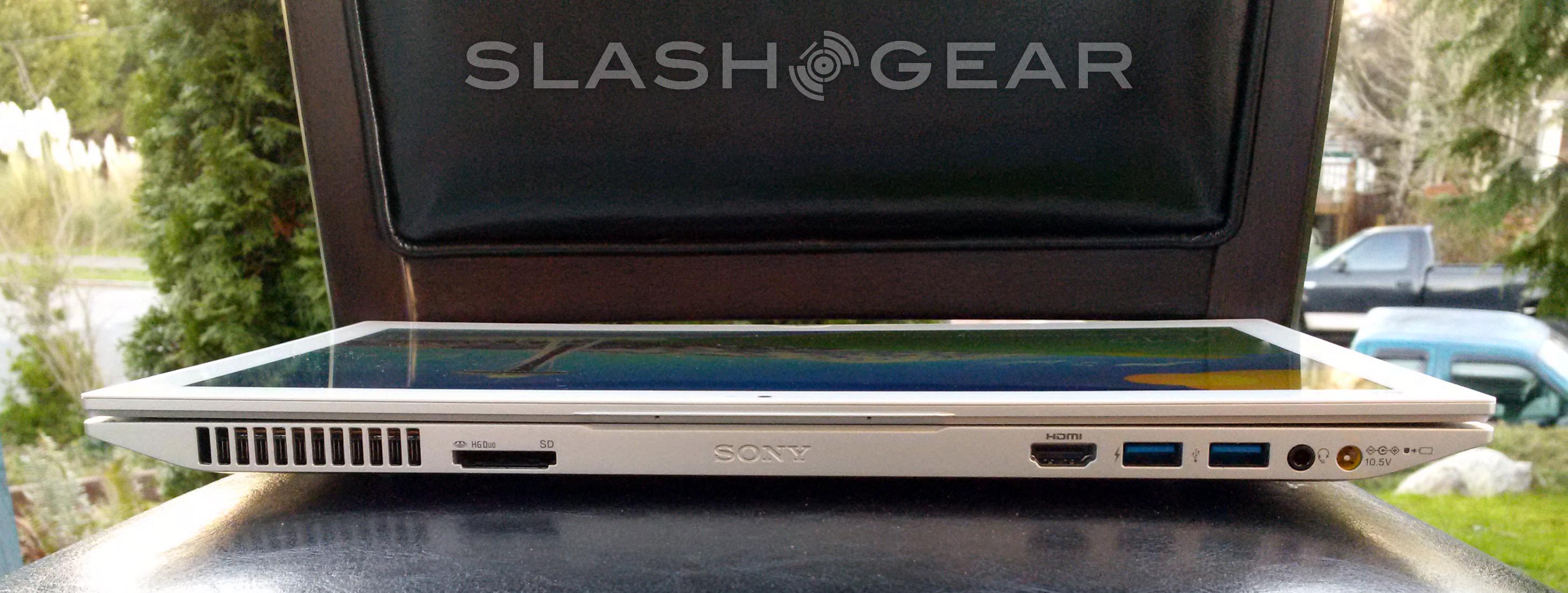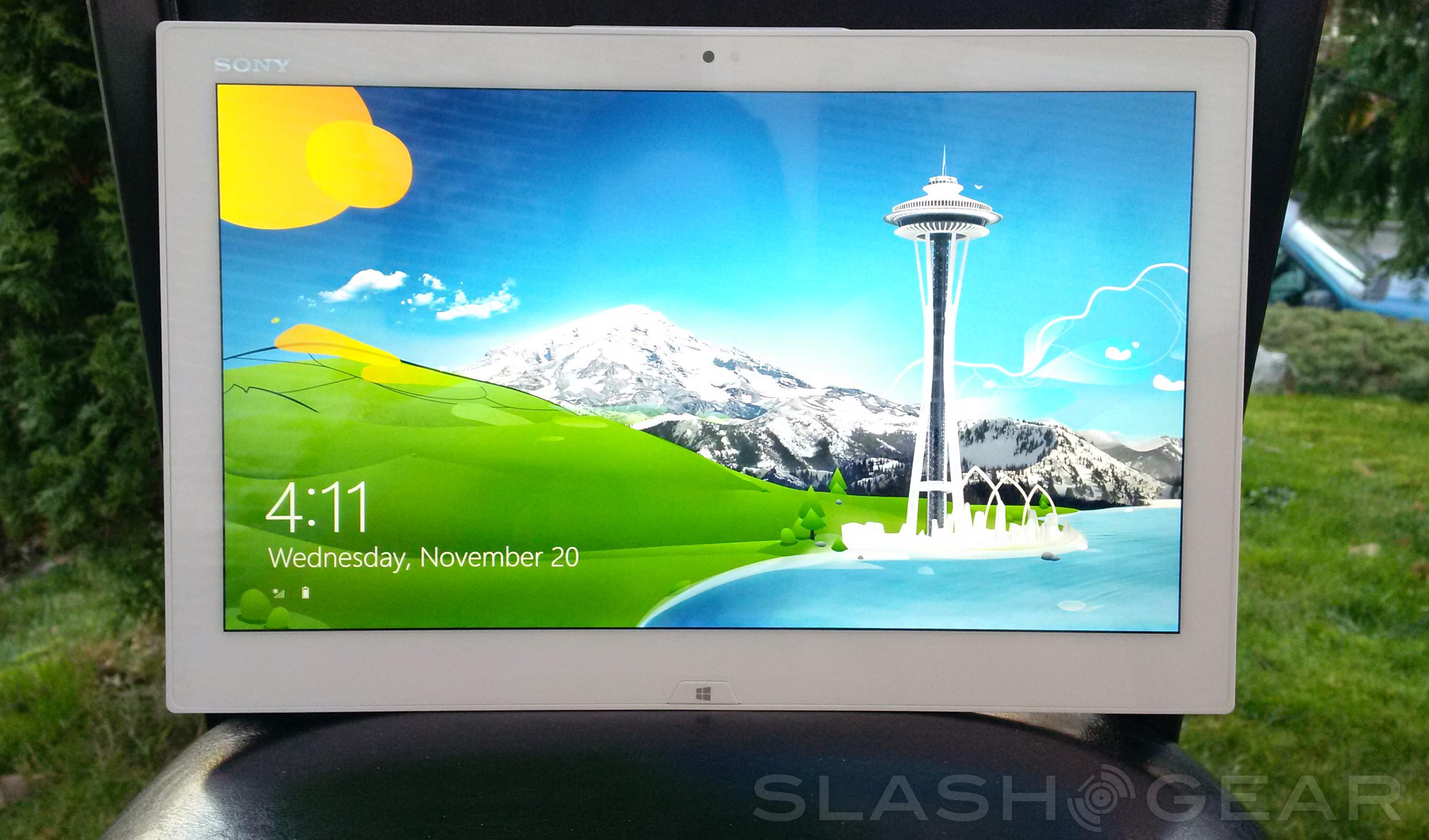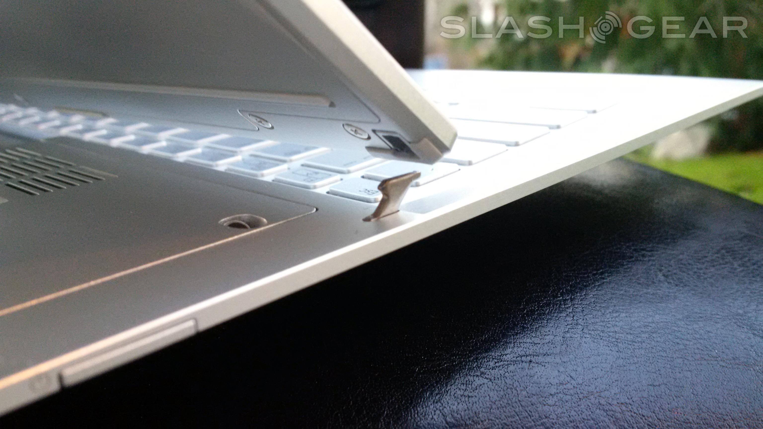 Though the hinge is different, the slider-style design we saw with the Sony VAIO Duo 11 is implemented with the larger model. Opening the display to switch the device from tablet to laptop is simple, requiring a gentle tug on the back of the display just behind the webcam. Once lifted half an inch or so, the hinge and sliding mechanisms take over and the display slides backwards.
