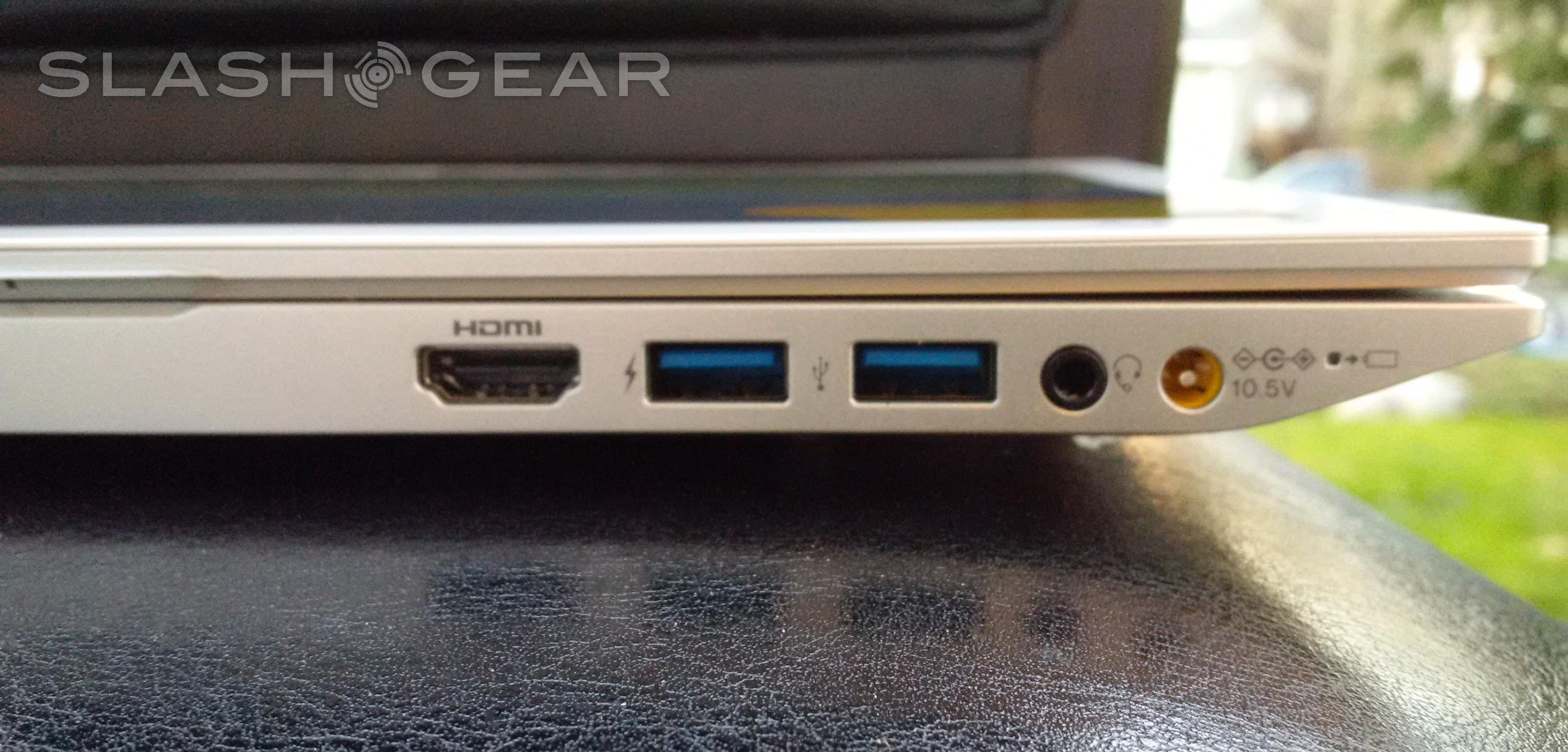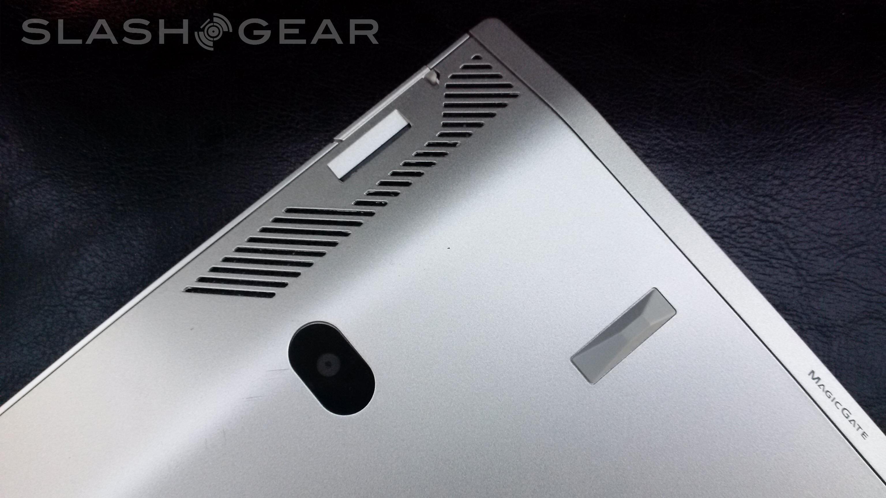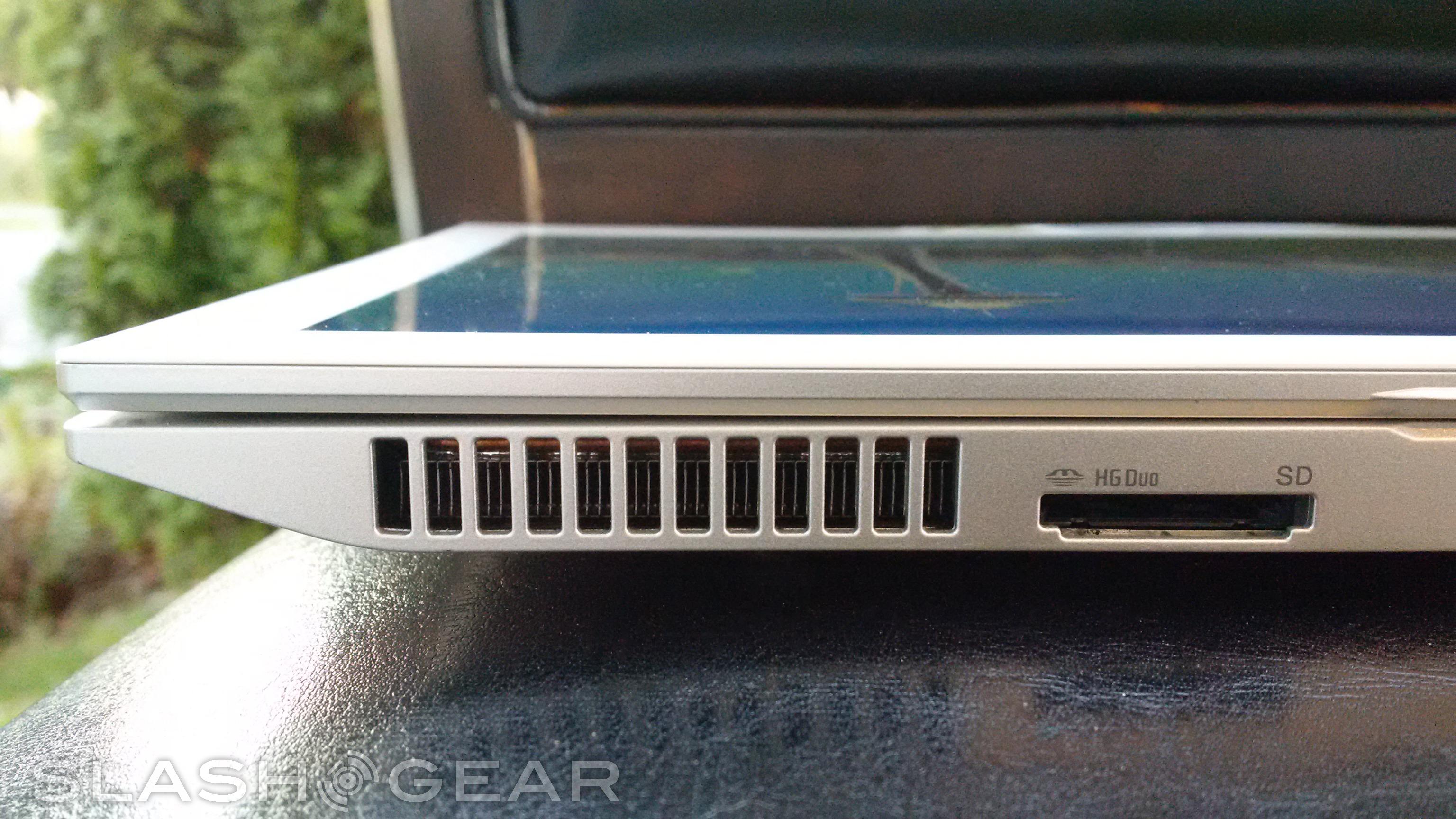 The ports are on the left side of the top edge, which is a nice design choice because it allows one to use the device as a tablet with cables attached without battling to keep them out of the way. The fan is on the right side of the upper edge (check out the gallery below), as well as the SD card slot. The power button is on the left edge and the stylus "inkwell" is on the right, both in convenient placement.