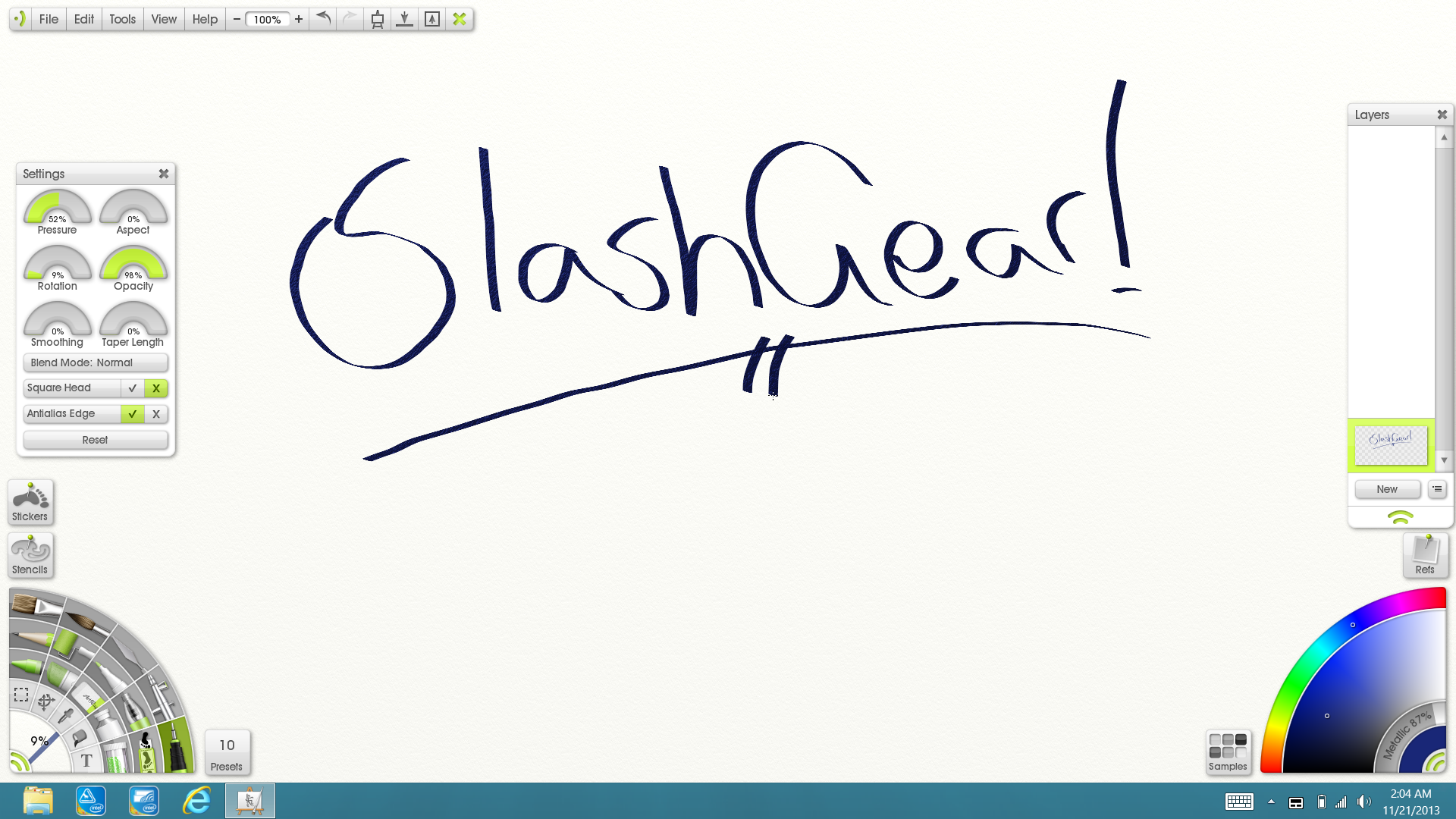 Not surprisingly, the VAIO Duo 13 is shipped with some touchscreen-centric software that utilizes the touchscreen and stylus, perhaps the most notable of which is ArtRage Studio Pro, a drawing application that provides various artistic mediums for drawing and painting. Software runs smoothly on the machine, thanks in no small part to the Intel Core i5 and 4GB of RAM. Windows 8 runs well on the machine and can keep up with your swiping and toggling without complaint.