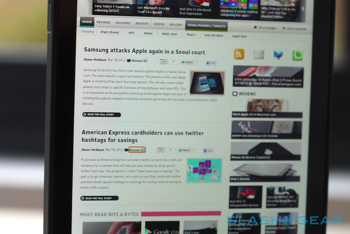 The crowning glory of the Xperia S is probably its display. Sony has had some great mobile panels on previous models, using the company's Mobile BRAVIA Engine to boost contrast and make for inky blacks, and the same technology is used on the 4.3-inch 1280 x 720 TFT panel here. It's crisp and beautifully pixel-dense, though viewing angles drop off quicker than, say, the Super AMOLED HD of the Galaxy Nexus. Still, face-on there's plenty to like about this screen, even if Sony appears to have deleted the auto-backlight option from the settings.