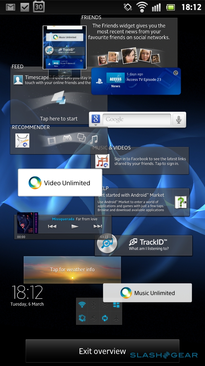 Without ICS, what you get is Sony's own custom Xperia skin, along with several preloaded apps and features of differing usefulness. There are the usual Android cluster – Gmail (though not the improved version of 4.0), YouTube, Google Maps and the Android Market, among others – then some of Sony's own devising, such as a new camera app, PlayNow music app, Timescape with social networking integration, and TrackID for identifying music. Music Unlimited and Video Unlimited get menu shortcuts but lead to Sony's site for you to actually download the apps themselves.