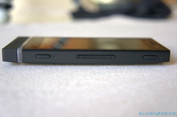 Pop the back of the phone off and you're greeting with a removable 1,290mAh battery and SIM card slot that's housed on the side rather than lurking beneath the power source. If you think you'll be able to swap it easily, no dice: the phone automatically restarts once you pop a new one in. The slot has a push-push mechanism similar to a microSD card slot, so it springs firmly into place.