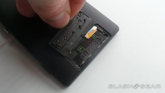 Around the edges you'll find a power button – a little above the center on the right side of the phone – as well as a camera shutter button and a volume bar. Each of these buttons rest on the right side of the phone, while the back has a rather large flap that pulls down and out to reveal slots for both a microSD card and a microSIM.