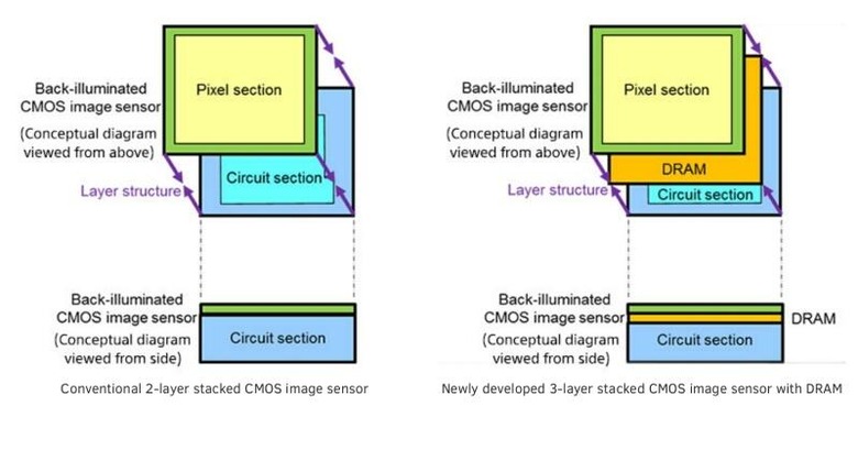 One will naturally ask what's the point in having DRAM or Dynamic RAM inside an image sensor. The purpose of RAM is to increase the data readout of the image sensor, considering RAM is one of the faster types of data storage and access technologies that is still within most budgets. In this particular context, the DRAM is sandwiched between the BSI (Backside Illuminated) structure of pixels above and the circuit layer below that handles signal processing.