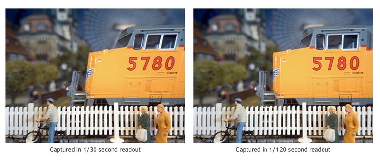 The DRAM thus acts as a sort of holding area that can quickly read data coming into the sensor that can then be passed on to a slightly slower processor down the line. In practice, this means that the sensor can capture the same amount of pixel information at a fraction of a second. Specifically for this sensor, it means 19.3 million pixels can be recorded at just 1/120th of a second, compared to the similar amount that requires a 1/30 second exposure. This also means that the sensor can do super slow motion capture at 1,000 fps even at 1920x1080 (Full HD) resolutions.