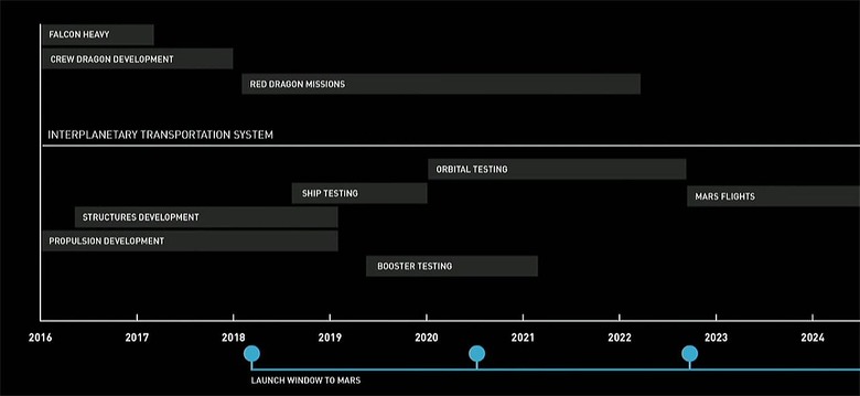 Red Dragon Missions begin in early 2018, while ship testing begins in late 2018. Ship testing should be complete by 2020, at which time Orbital Testing will begin. Booster Testing begins in the 2nd quarter of 2019 and should be complete by Q1 of 2021. Red Dragon Missions should be complete in early 2022, while Orbital Testing should be complete in the third quarter of that same year.