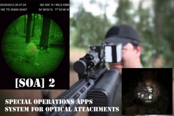 The military has been testing the use of off-the-shelf smartphones and tablets for a while. The idea is a smartphone like the iPhone or a tablet such as the iPad can be used to run specialized applications for military personnel that will allow them to get improved intelligence when they need it. A company called Special Operations Apps has announced an interesting new attachment for the iPhone and iPad to military-grade optics called the [SOA]2.