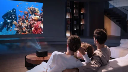 If you're looking to take your viewing on the go, you might want to try the Projector T2 Series from the Anywhere Cinema collection. The Projector T2 offers 1080p FHD fidelity with a hearty 450 ANSI Lumens. It's got a sturdy design with a built-in handle so you can carry it anywhere, as well as a built-in battery good for 2.5 hours of continuous viewing. Its JBL speakers will give you the sound quality you want, though they're also good for playing music with the T2's dedicated music mode. By upgrading to the T2 Plus, you'll receive a Smart TV dongle with access to over 7,000 streaming apps. And for Keith Haring fans, the T2 Keith Haring Edition is a perfect choice.