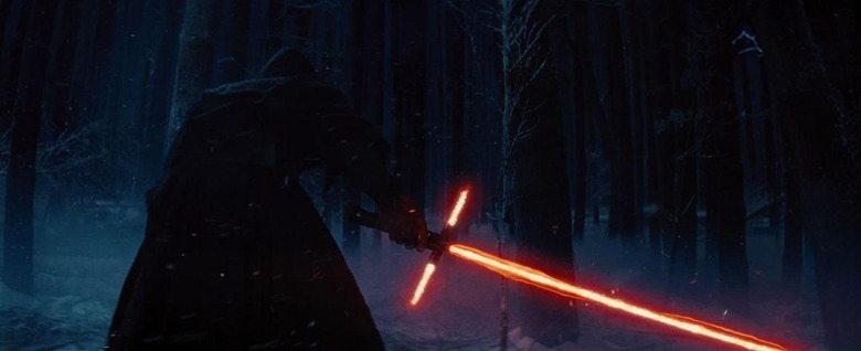 In the woods on a snowy planet we see what's likely our first glimpse of Adam Driver (see above John Boyega link for more information on this actor). Driver is set to be the dark force in this trailer, and here it's clear he'll be rolling with a type of lightsaber we've not yet experienced – complete with three blades where before, only one – or two – would do.