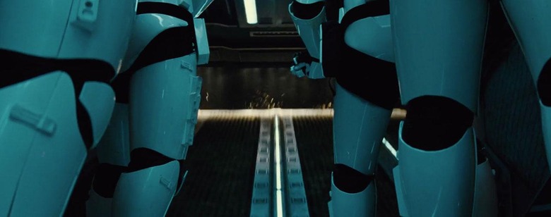 A view of this Stormtrooper squad shows an opening ship door with sand flying off the latch. This and the appearance of Boyega in the sand earlier on suggest we'll be seeing our fair share of Stormtroopers on Tatooine, not unlike A New Hope.