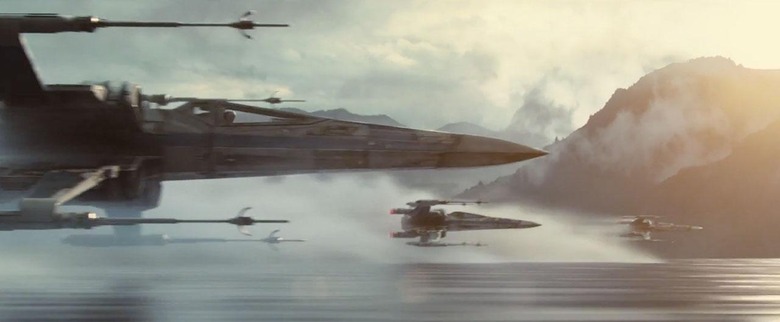 Three next-generation X-Wing starfighters fly close to the surface of a lake on a planet we've likely never been to in this film series before.