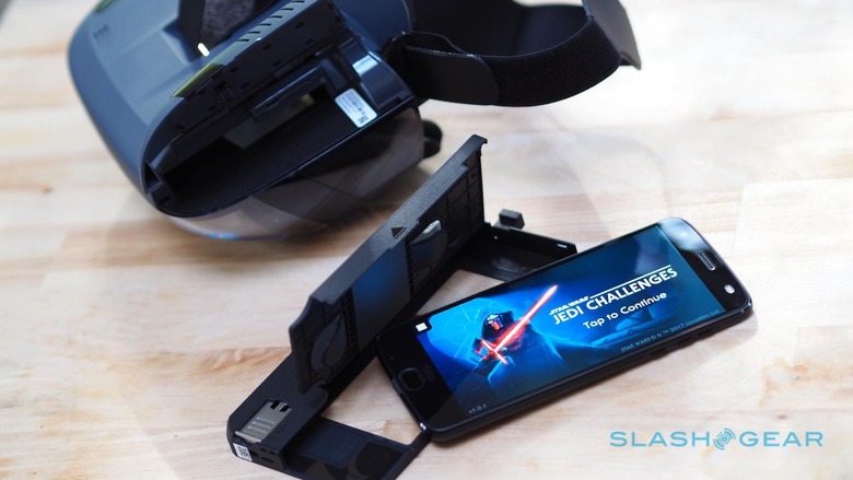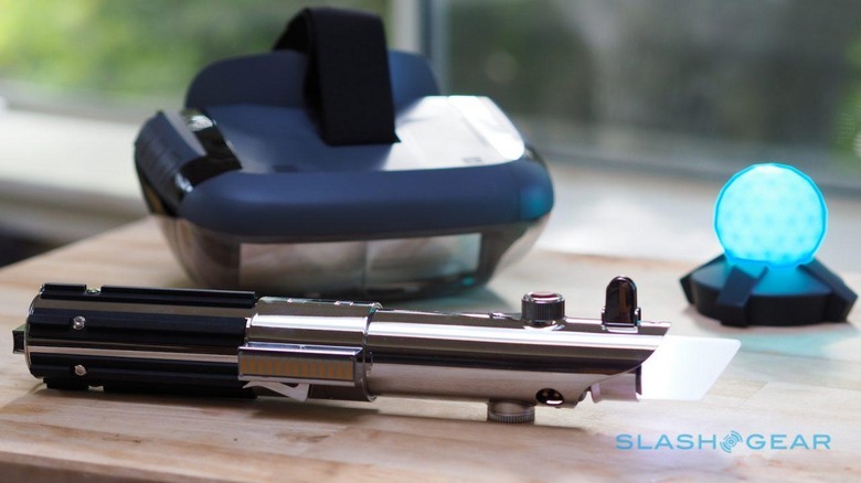 It's a fairly clever system. Like Daydream, Gear VR, and other phone-based headsets, Jedi Challenges relies on your smartphone being slotted inside and donating its display; the AR Mirage also uses its speakers, too. Unlike those virtual reality systems, however, the phone isn't directly in front of you.