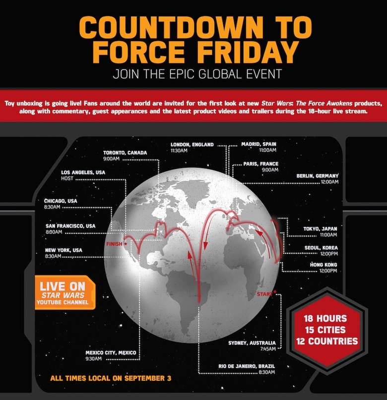 The Star Wars YouTube channel will be hosting the live stream. Each city will see a YouTuber popular for their "unboxing" videos give the first look at a Star Wars: The Force Awakens-inspired product, followed by the event moving on to another city.