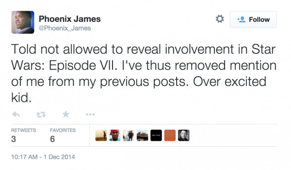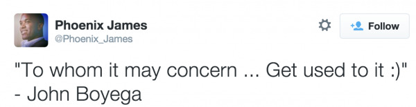 BONUS: James most recent tweet quotes a letter from Boyega to the public, thanking them for their well-wishes and slyly sending a shout-out to those that called out his having black skin in a Stormtrooper as being strange. This reinforces James being a Stormtrooper and adds a bit of fuel to the idea that the empire has always chosen Stormtroopers with skins of every shade – since the beginning.