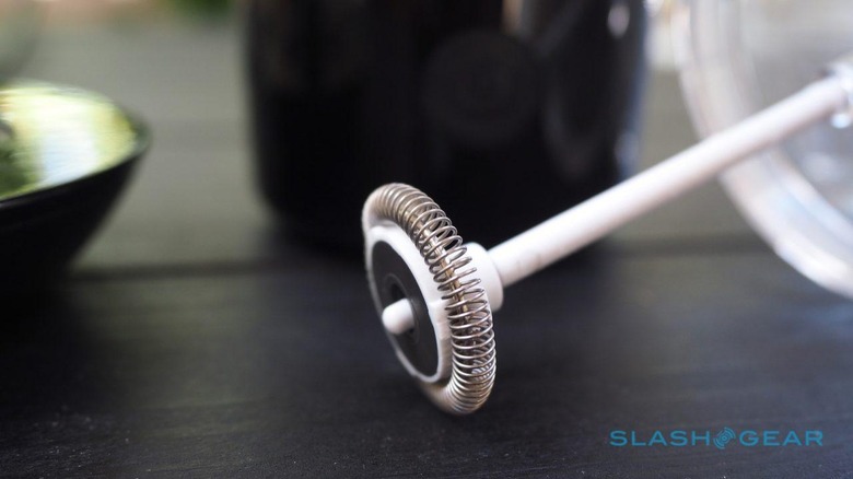 The lid has a whisk extending from it, propelled into a spin by magnets underneath the chamber. You can fit a small metal whisk to it for a cappuccino, or leave it off for a latte: with the former you get more foam and less liquid, while the latter gives you more liquid and just a smudge of foam. Sit the whole thing on the base station, press the button on the front once, and after 80 seconds your milk is not only whisked but heated too (you can long-press the button and skip the heating for cold drinks too).