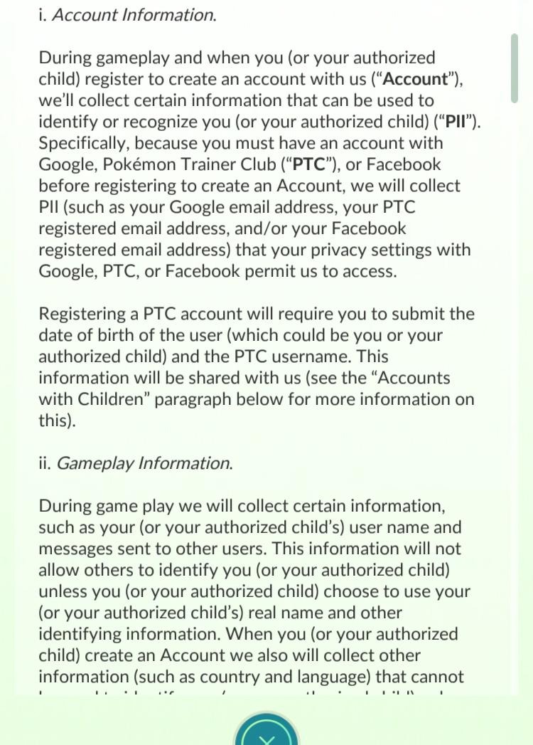 ABOVE: A segment of Niantic's Privacy Policy for Pokemon GO