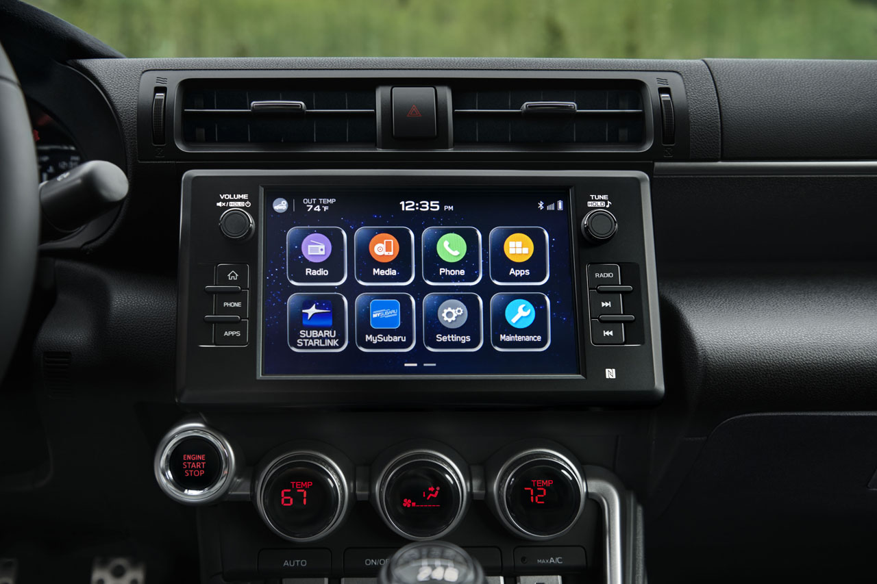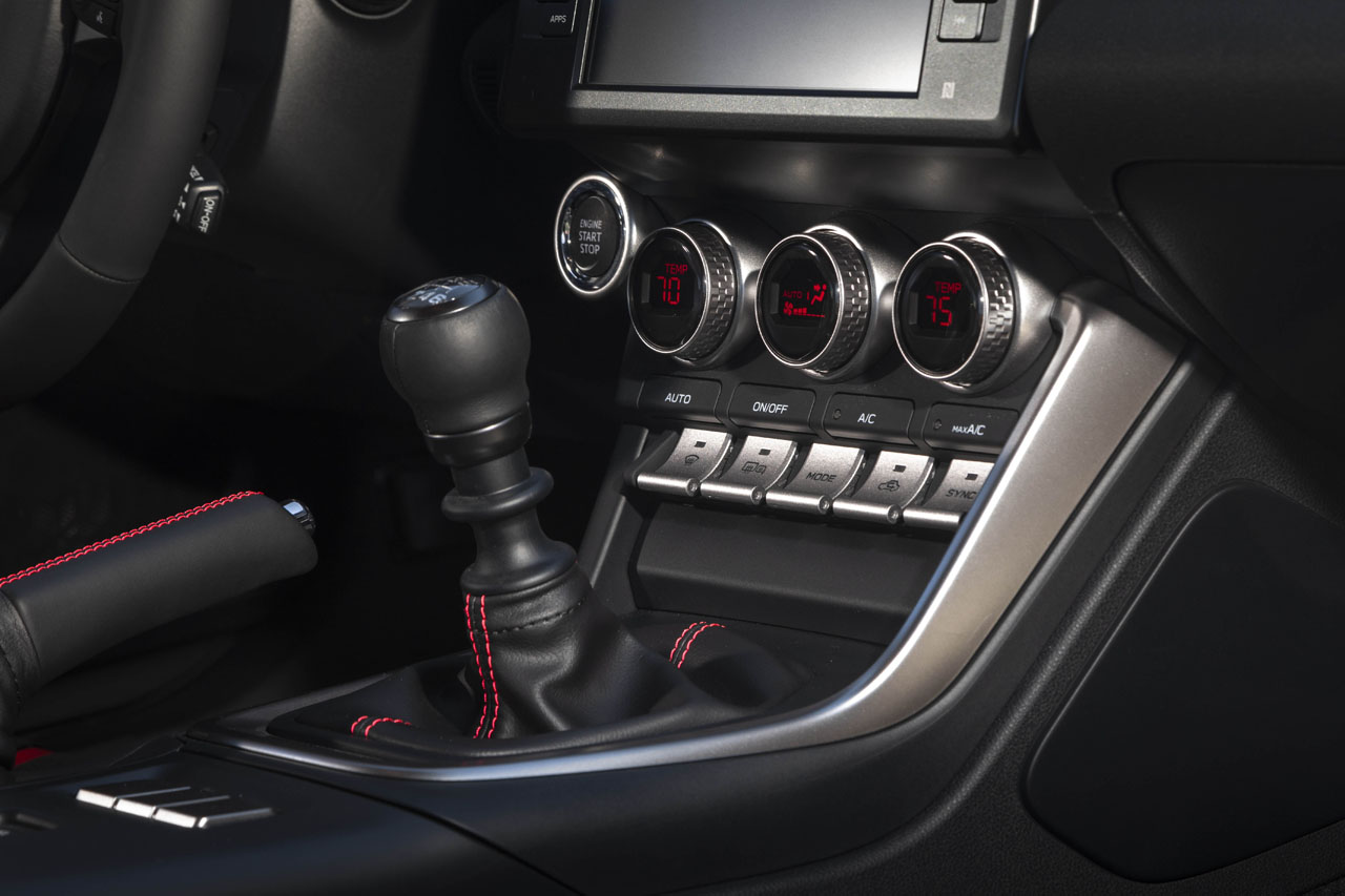 For 2022, Subaru offers the BRZ with either a 6-speed manual transmission or a six-speed automatic. Both vehicles have the same list of standard features, including a Torsen limited-slip differential, keyless access with pushbutton start, LED headlights, vehicle stability control with track mode, 17-inch wheels, dual-zone automatic climate control, incline start assist, heated exterior power mirrors, power fuel-door lock, power windows, rear center console storage with USB ports, and intermittent windshield wipers with a speed-sensing this feature. For 2022 the TPM system also supports two sets of wheels to be registered, allowing a change to seasonal tires.