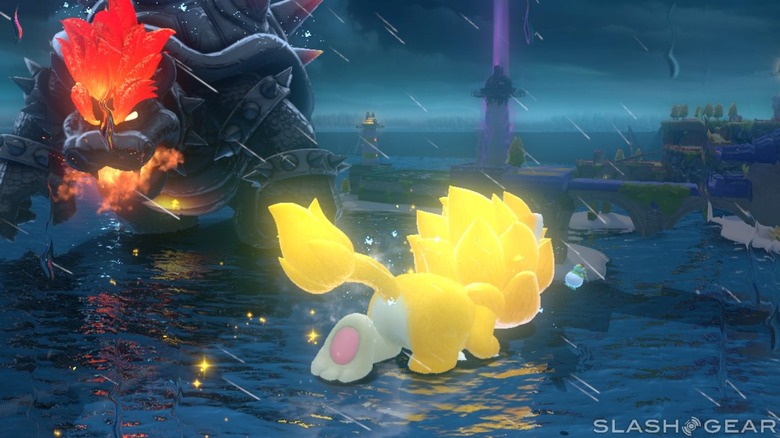 Bowser's Fury is an open world adventure that will last most players 3-6 hours and actually sees Mario teaming up with Bowser Jr. to stop Bowser, who has become a giant, corrupted, and particularly ruthless version of himself. You'll progress through different areas of this in-game world as you play, collecting cat tokens and occasionally going one-on-one with Bowser himself, growing to his size through the use of the Giga Bell. Those battles definitely have a Godzilla feel to them, as two titans who dwarf everything else in the world square off.