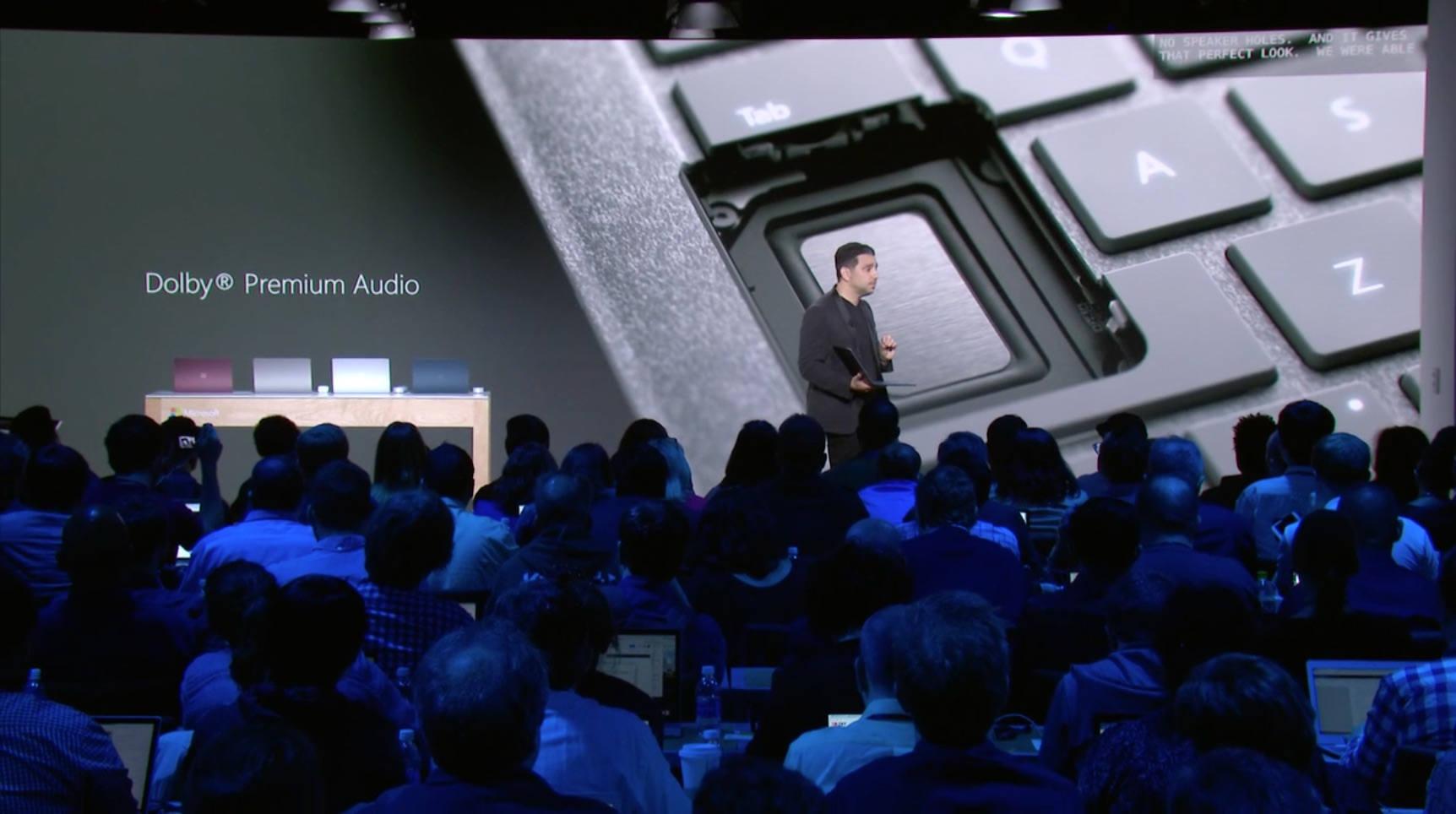 Around the edges are a Surface Connect port, USB 3 (USB-C), and miniDisplayPort. As well as a standard headphone jack, thank god. Inside is a battery that Microsoft suggests will give users 14.5-hours of uptime. While Microsoft will be running the peripherals game like Apple with their MacBook and MacBook Pro, they'll be pushing battery life so good there's no need to bring the charger with – not that that's something we'll be doing or anything.