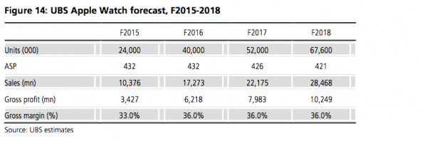According to UBS, 10% of iPhone owners are "very likely" going to buy the Apple Watch. In fiscal year 2015 (likely the 'real' fiscal year, not Apple's weird cycle), UBS thinks Apple will move 24 million wearables, too.