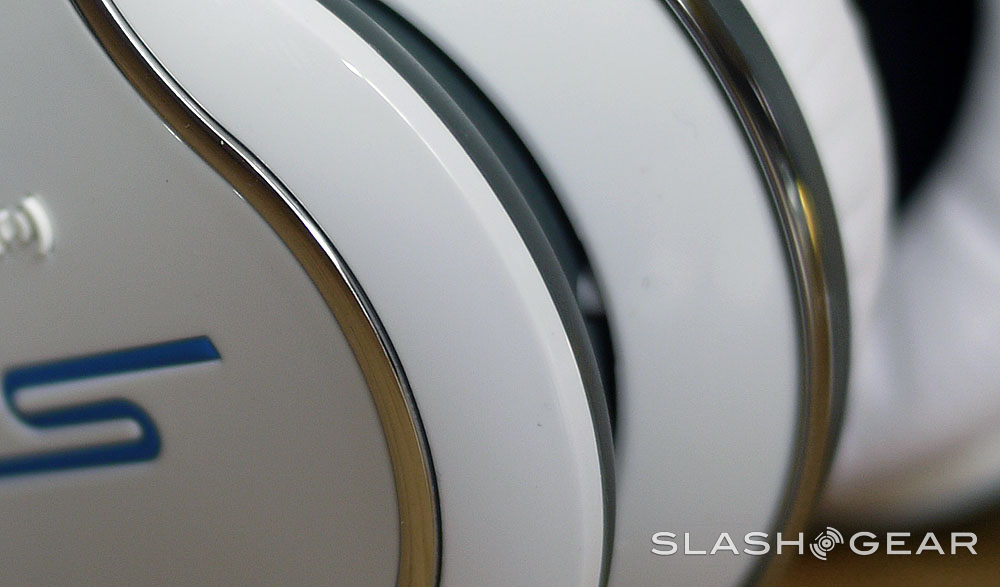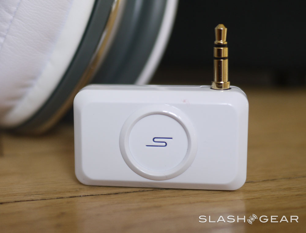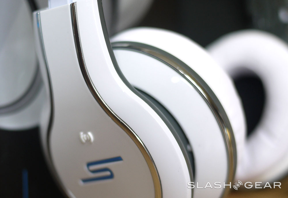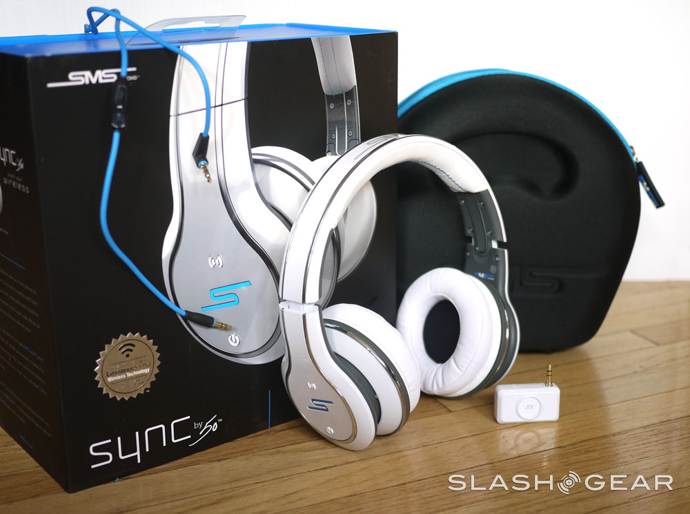 What we've got here is a pair of wireless headphones by the name of Sync by 50, made by SMS audio and sent out in the first wave of headphones approved and tuned personally by 50 Cent and crew. This model is the shiny white version of these bluetooth-enabled phones, a black version also available in stores now – both of these models lit up by the "S" logo on either ear and connected to your bluetooth devices with a dongle about half the size of a pack of gum, and twice as fat. Are these massive and massively flashy headphones worth their equally massive price tag at $399.95? Let's find out!