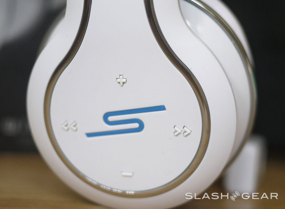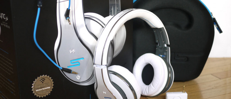 What we've got here is a pair of wireless headphones by the name of Sync by 50, made by SMS audio and sent out in the first wave of headphones approved and tuned personally by 50 Cent and crew. This model is the shiny white version of these bluetooth-enabled phones, a black version also available in stores now – both of these models lit up by the "S" logo on either ear and connected to your bluetooth devices with a dongle about half the size of a pack of gum, and twice as fat. Are these massive and massively flashy headphones worth their equally massive price tag at $399.95? Let's find out!