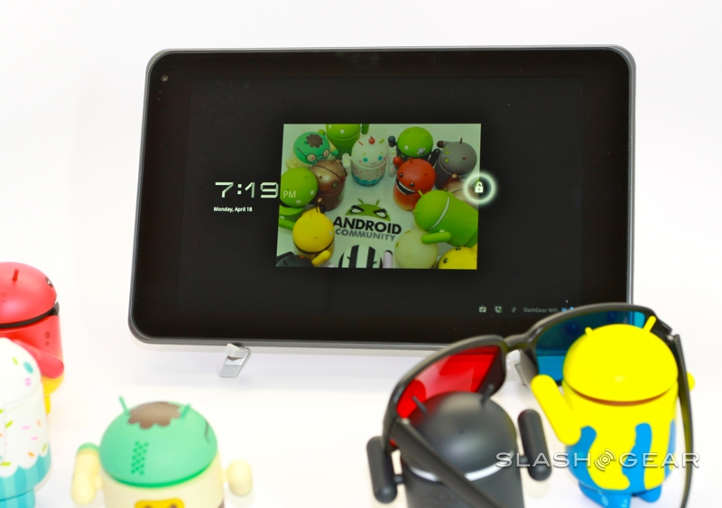 On the front is a 2-megapixel camera for video calls, while a dual 5-megapixel camera array on the back – with a single LED flash – supports 3D photography and video capture. In-between the two lenses there's a flip-out metal kickstand, useful for propping the tablet up for video playback (though generally not at the right angle for standalone 3D recording). We often found ourselves smudging the rear lenses when holding the G-Slate in portrait orientation. Ports include microUSB and HDMI on the bottom edge, as well as contact points for the optional docking station, and a 3.5mm headphone jack on the left edge. Volume controls and a power/standby button are the only physical keys to be found.