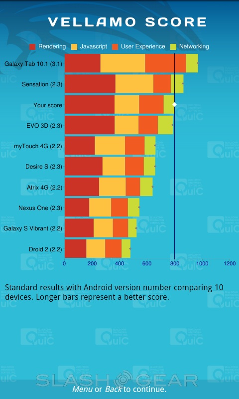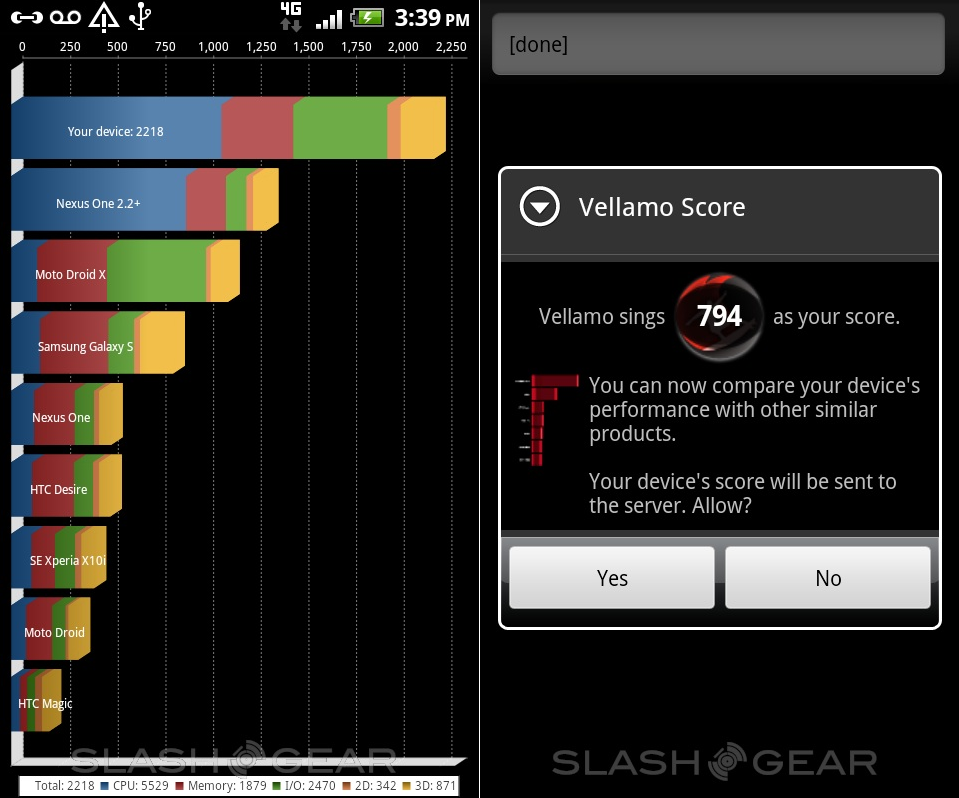 It does have Android 2.3.4 as well as a front facing camera but they have added Qik for your video calling needs rather than using G Talk. I would have tested the front camera but we all know how that goes these days. Quality could be better but its decent for what it is. Speaking of performance I did however run a few benchmarks because we all love those. Quadrant racked up a score of just above 2200. For comparison the higher resolution EVO 3D scored around 2100 in my EVO 3D Review. Here are a few results from both Quadrant, and the new benchmark app Vellamo