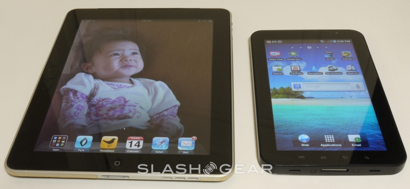 In comparison to the iPad (review), the Galaxy Tab is roughly half the size: 4.7 x 7.5 x 0.5 inches and 13.4 oz. thanks to its predominantly plastic construction.