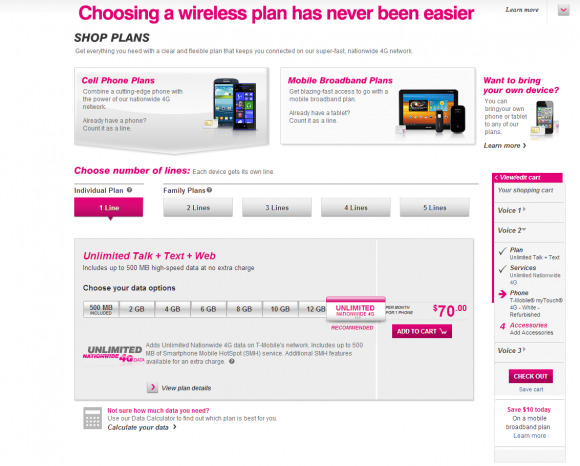 T-Mobile's new contract-free value plans have just gone live. All of the new plans will have unlimited calling and unlimited texting included. The cheapest plan available is the $50 unlimited talk, text, and 500MB of data plan. If you want to increase your data limit, you can do so for an accumulative $10 charge. So for the 2GB plan, you'll have to pay $60, 4GB you'll have to pay $70, etc. After you reach your data limit, your data will be throttled to 2G speeds. All of the tiered data plans come with free Mobile Hotspot, so you can tether your phone to your laptop or PC.